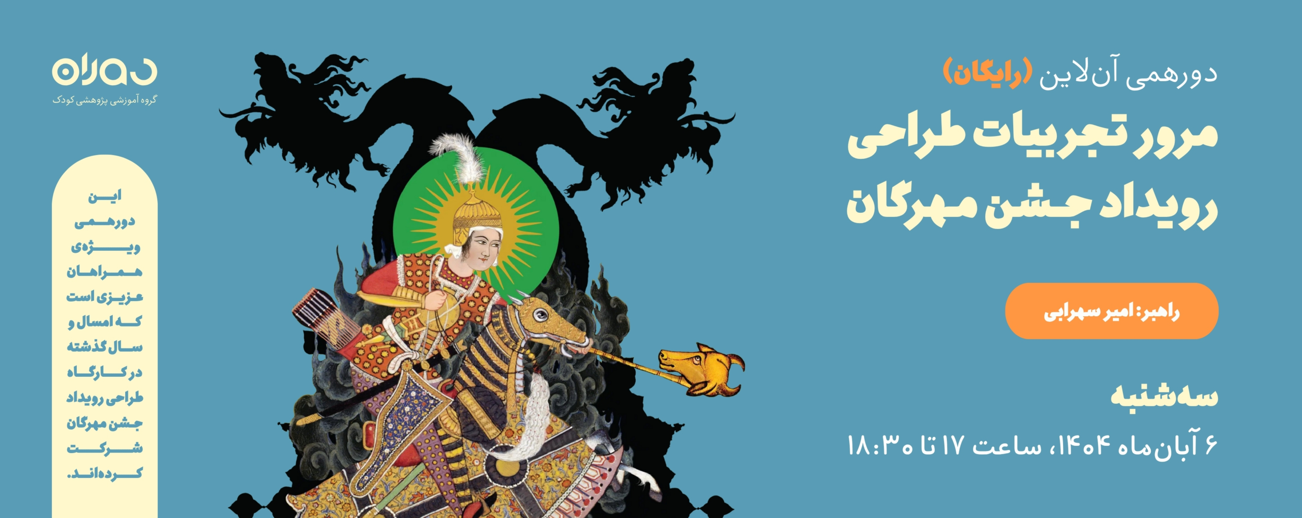 از همین رو، دوران با همکاری با امیر سهرابی، فارغالتحصیل رشتهی نمایش، پژوهشگر شیوههای اجرایی فولکلور و مدیر موزهی عروسک و اسباب بازی، کارگاهی مجازی (آنلاین) جهت “انتقال تجربیات طراحی رویداد جشن مهرگان” تدارک دیده است.